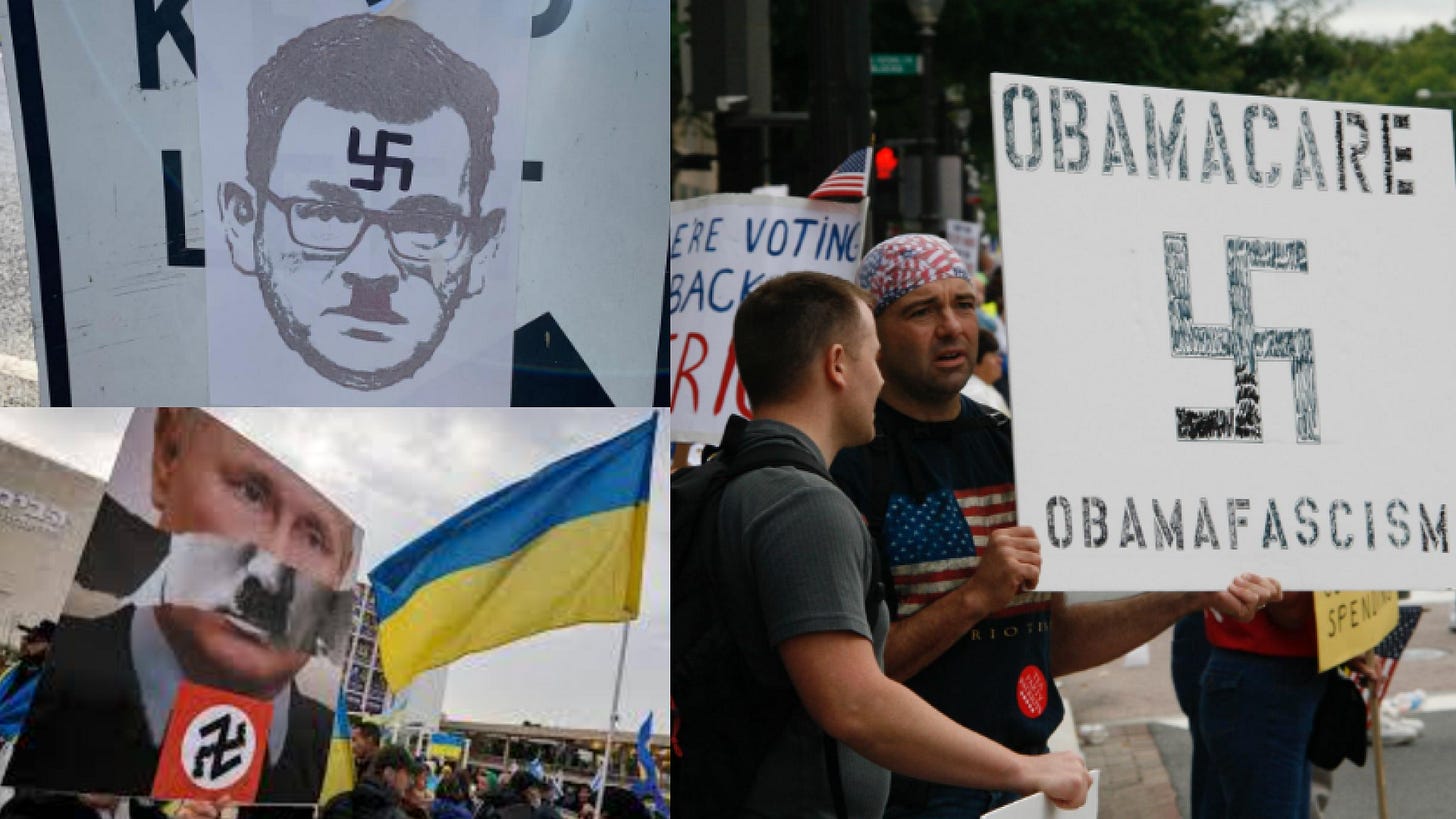 Those who use prohibited symbols (particularly the swastika) to make political comparisons on protest signs, flyers or street art as a form of political commentary also find themselves in legal jeopardy. Such commentary has long been used by various parts of the political spectrum to criticise political figures who are, or are perceived to be, authoritarian or supportive of authoritarian policies. I will include some examples below.